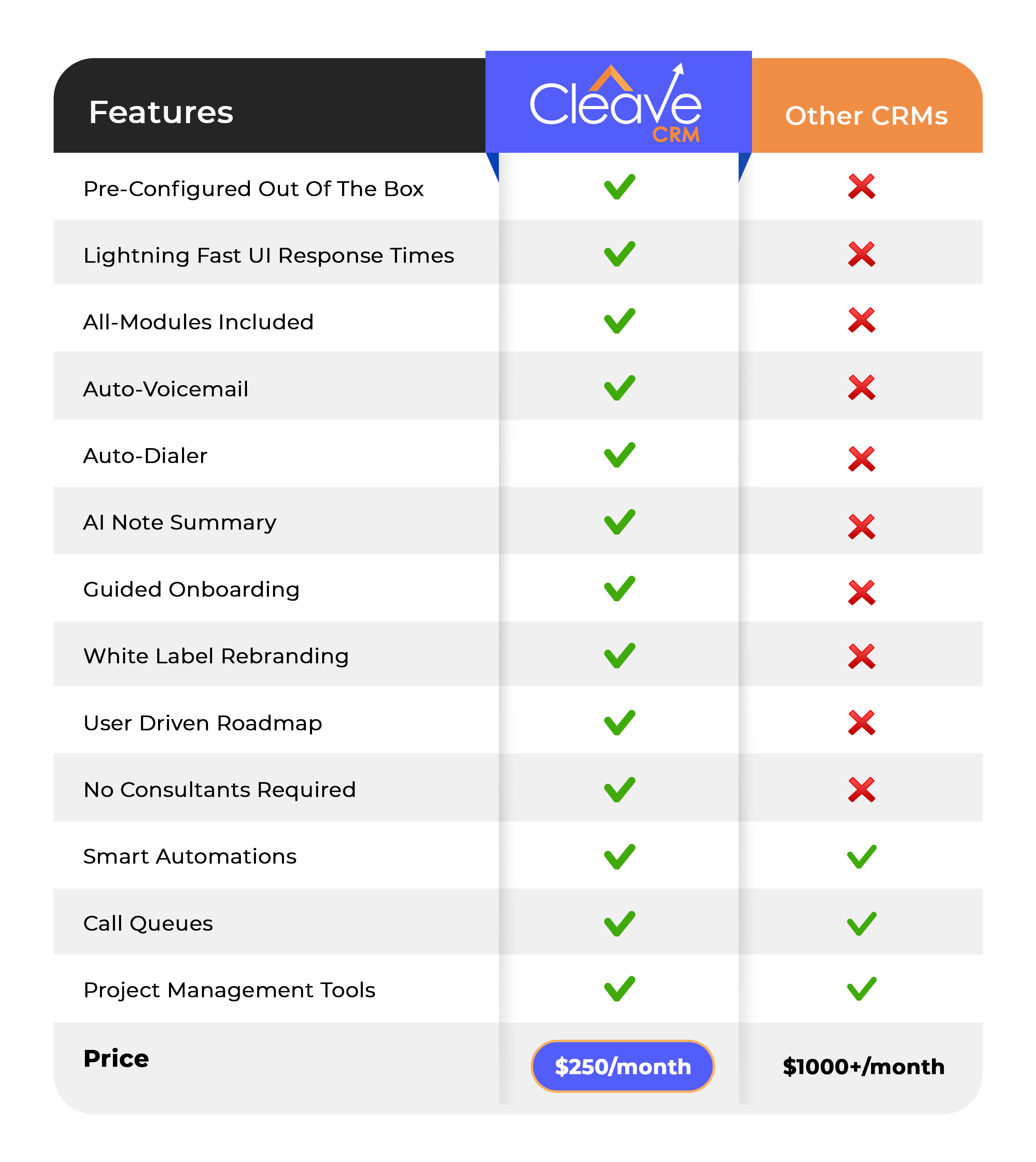 Other CRMs are expensive, complicated, & take forever to set up. Cleave is built to be simple, fast, and usable on Day 1!